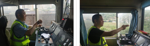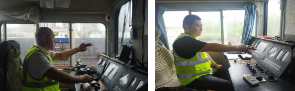司機(jī)吳登倫正在和信號樓進(jìn)行要道還道            副司機(jī)王汶棋正在確認(rèn)進(jìn)路和信號